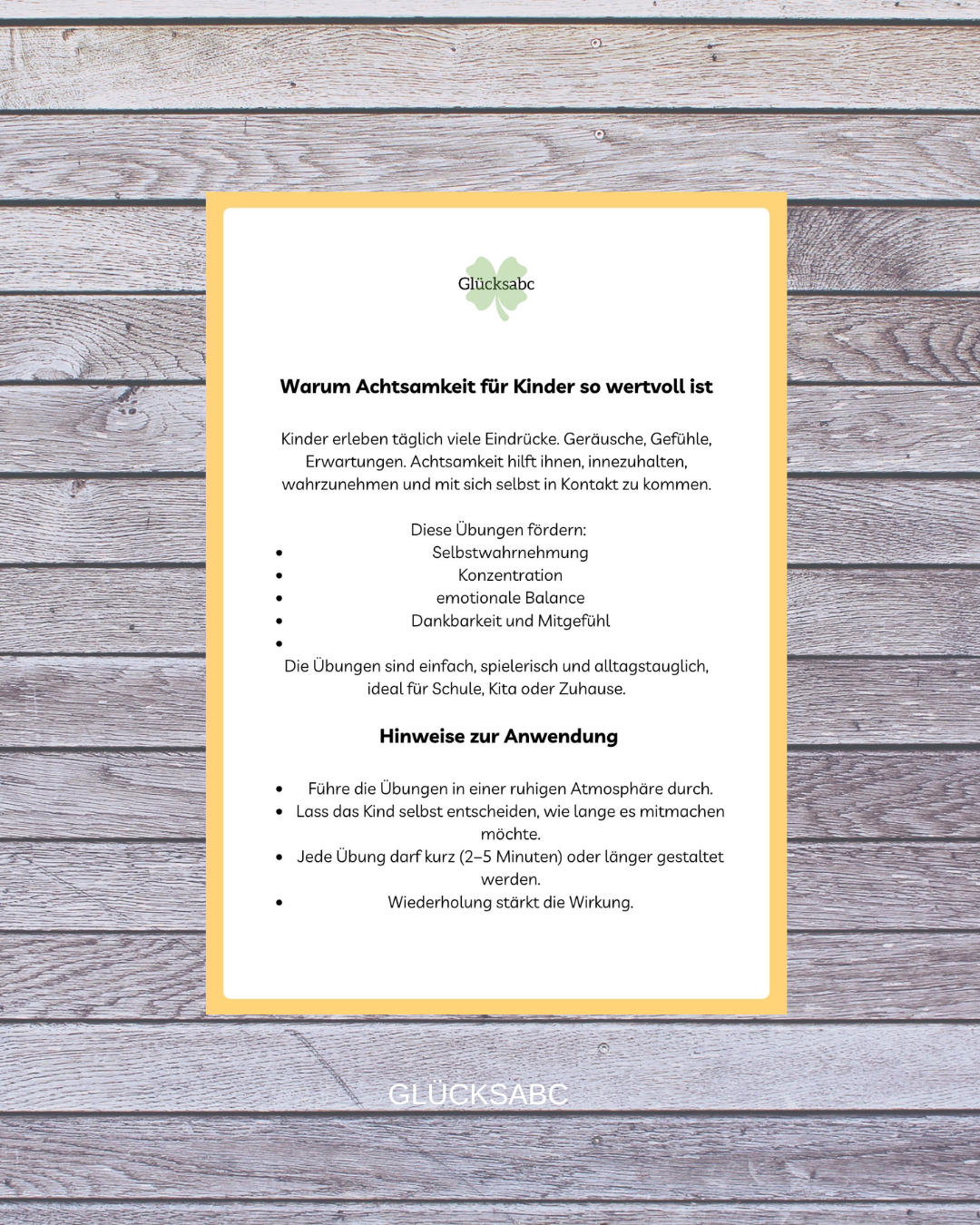 Achtsamkeit hilft Kindern, sich zu entspannen und den Moment bewusst wahrzunehmen. Mit diesem liebevoll gestalteten Material lernen Kinder spielerisch, ihren Körper, Atem und Gedanken wahrzunehmen, kleine Pausen einzulegen und innere Ruhe zu finden.